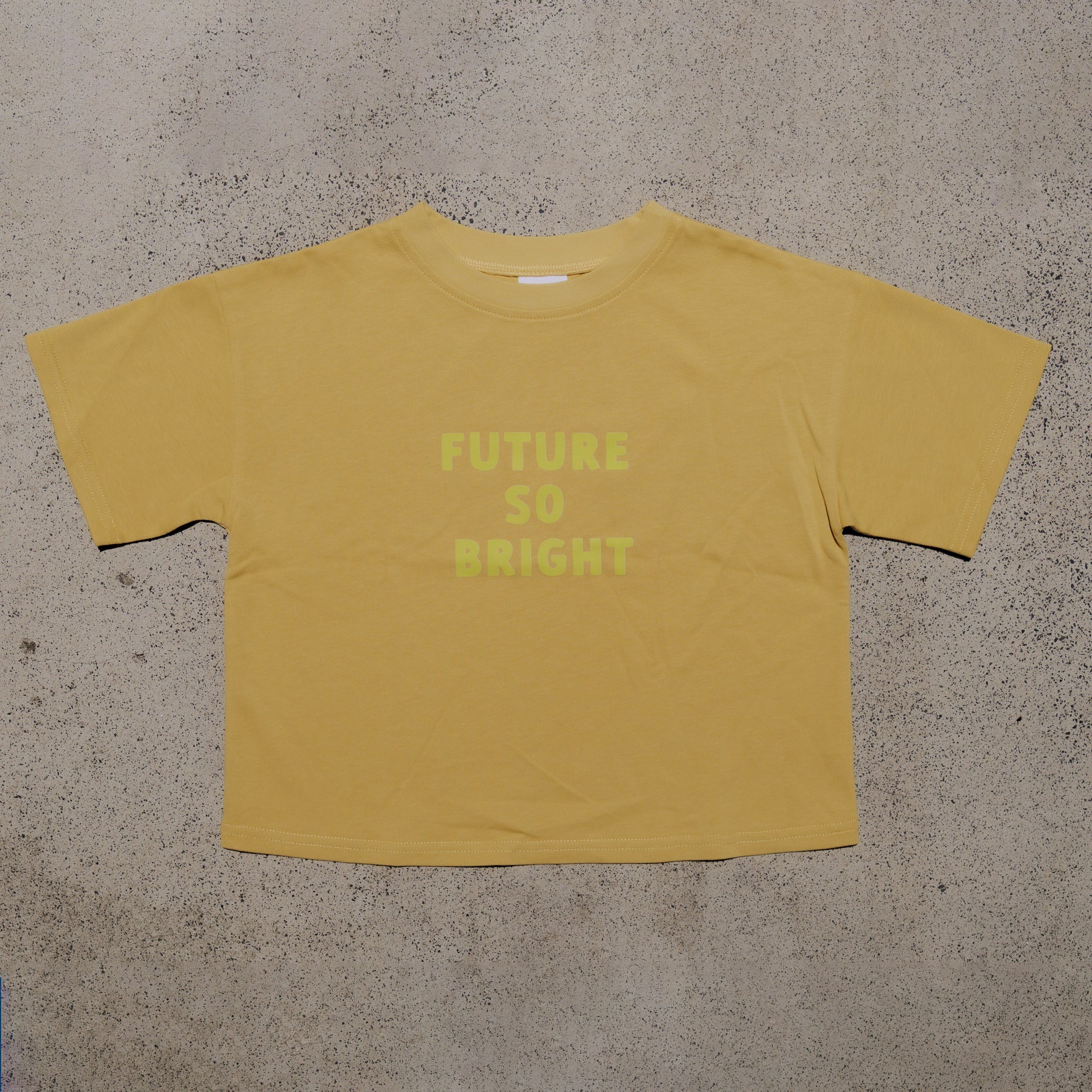 Child wearing a lemon tee with mum needs a margi text, standing against a white wall with green foliage.