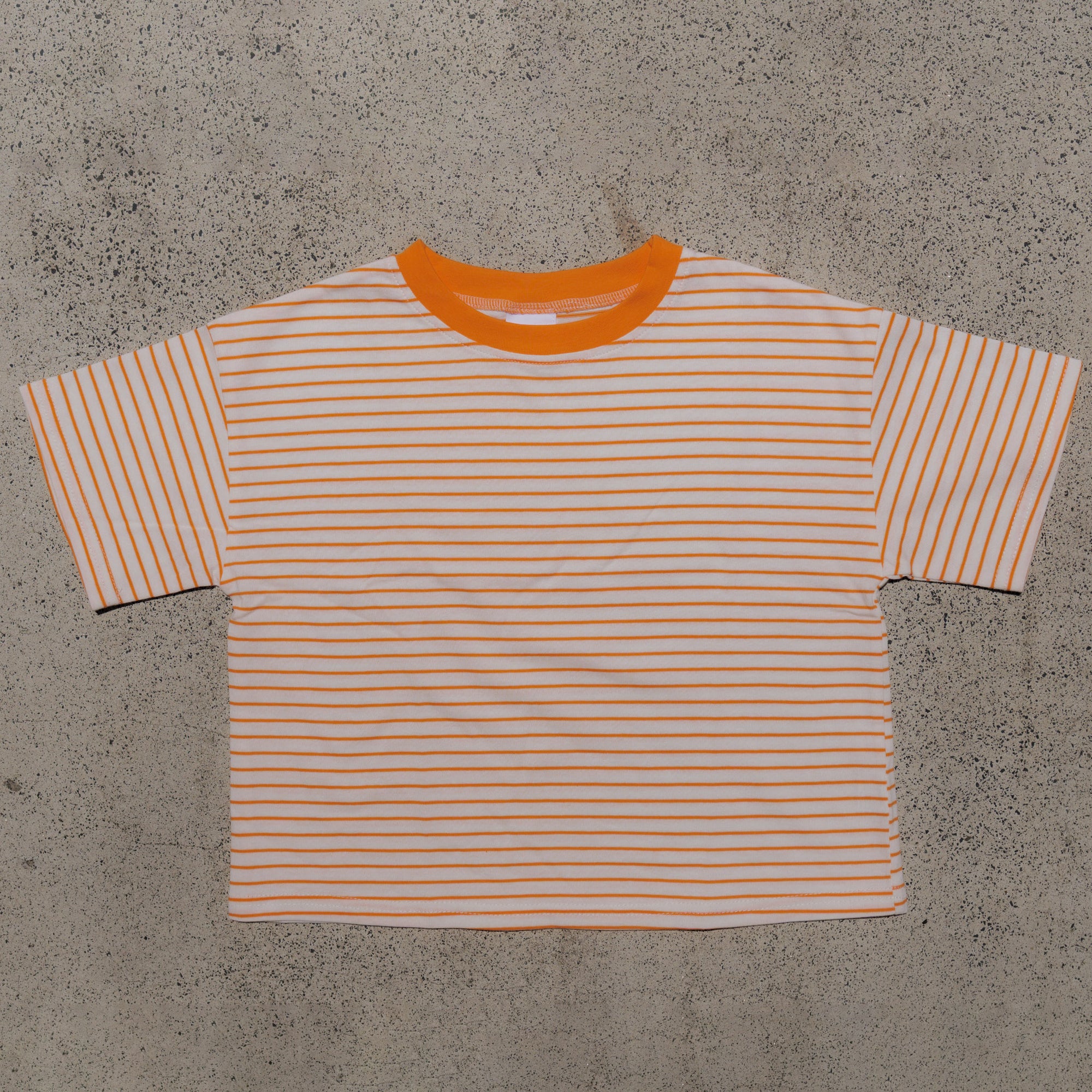Child wearing a beige t-shirt with mum needs a coffee text and striped shorts standing against a light background