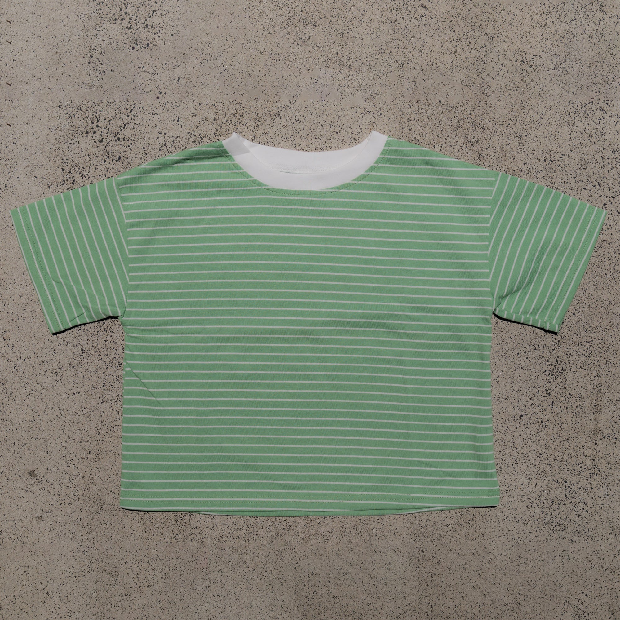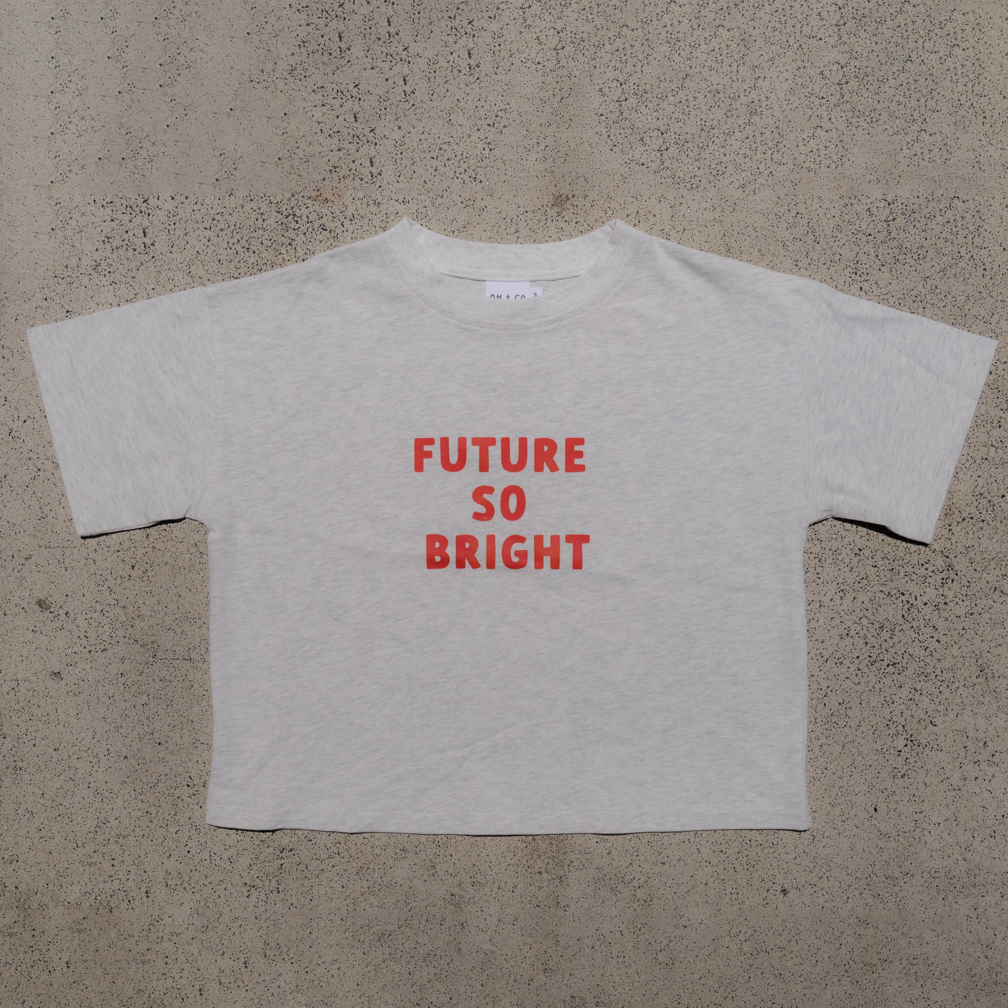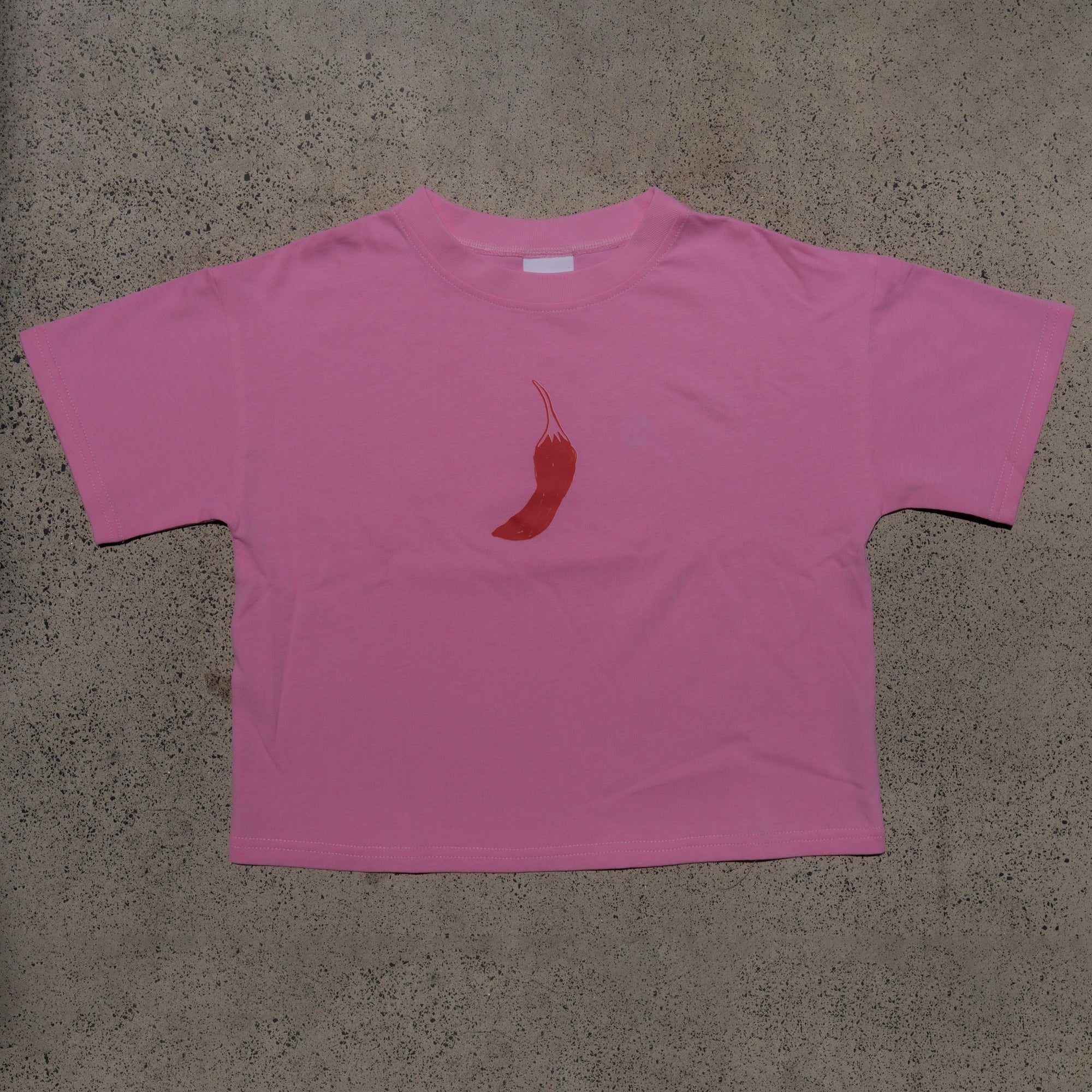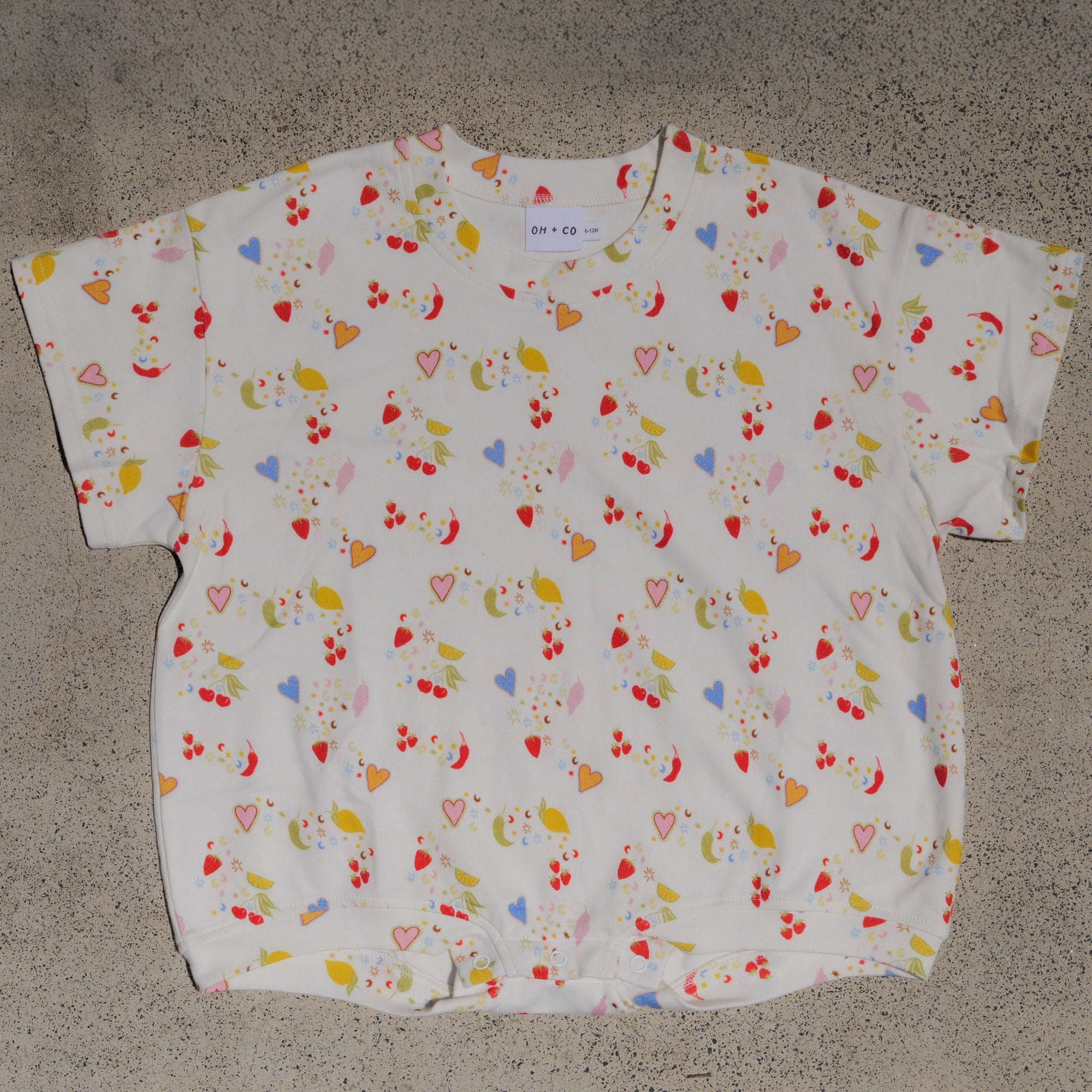 Child wearing a white shirt with red and pink heart patterns, sitting on a concrete surface.