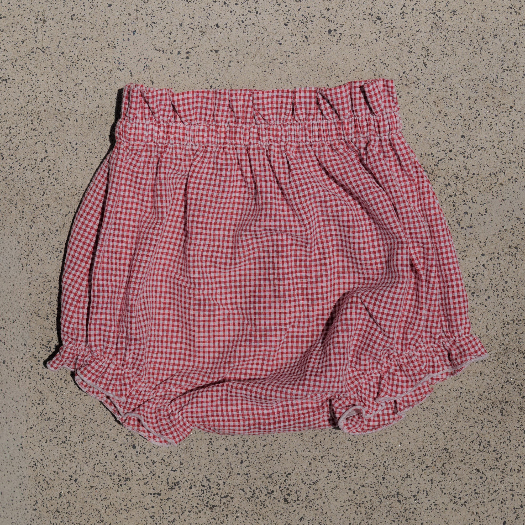 Person wearing a red checkered shorts  against a leafy background